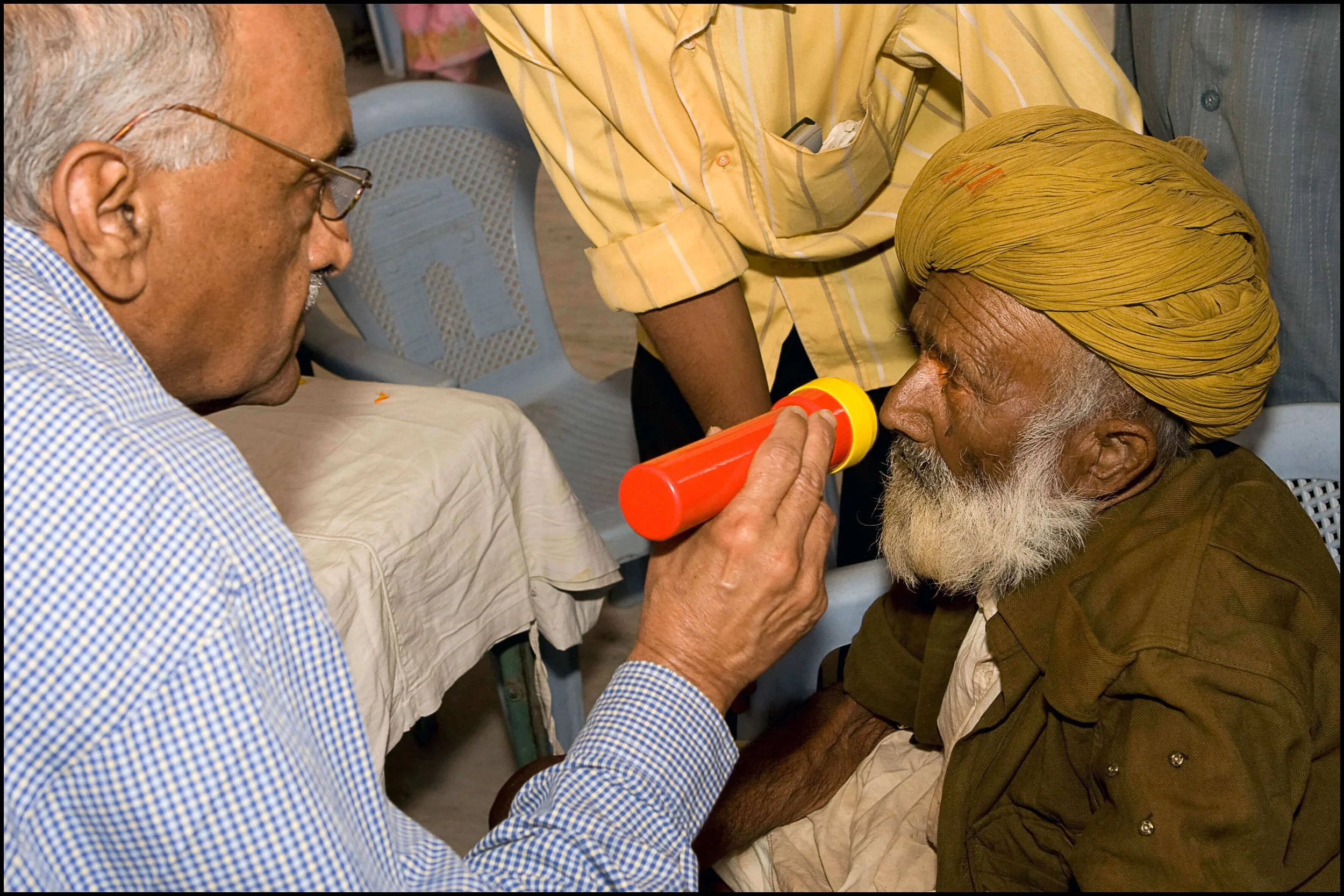 In conjunction with private eye hospitals in India, CBI established eye camps in rural India where patients could come and have their cataracts removed and be given eyeglasses with strong lenses to restore their vision, all at no cost to the patients.