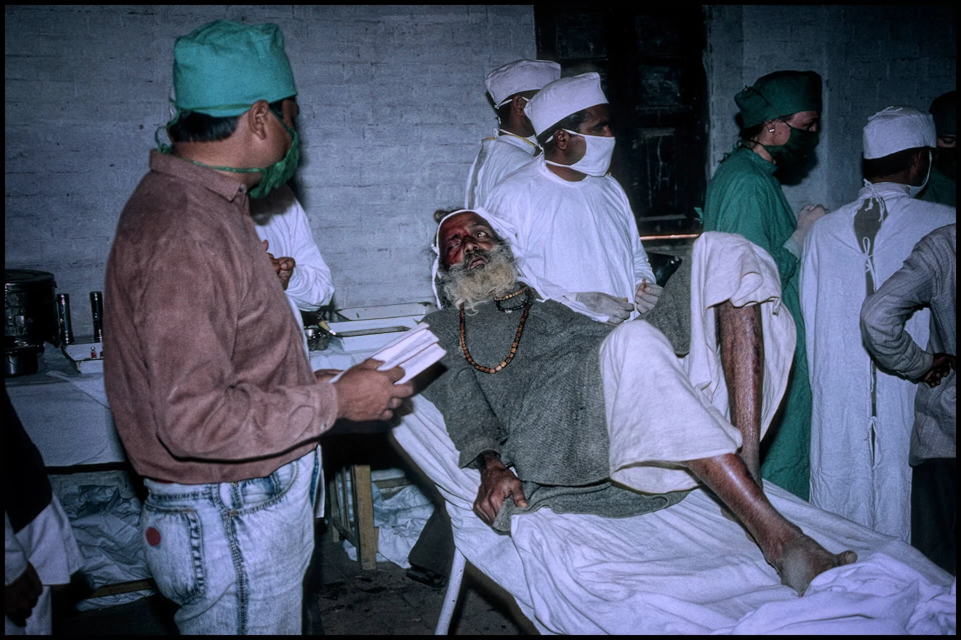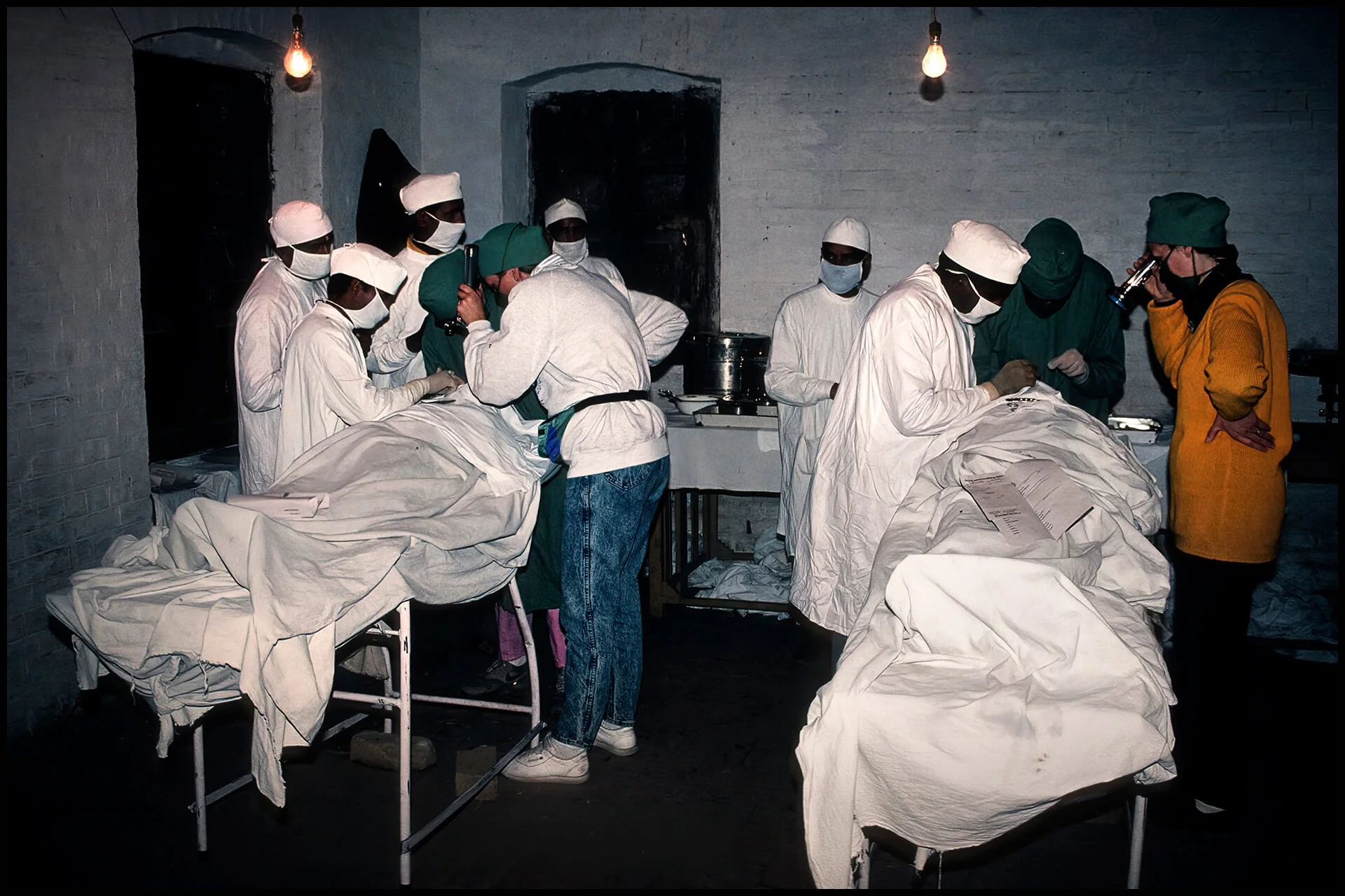 There were three operating theatres, all converted from their prior use as school rooms. Power was provided by portable generators and light was provided by over-head bulbs and flashlights.